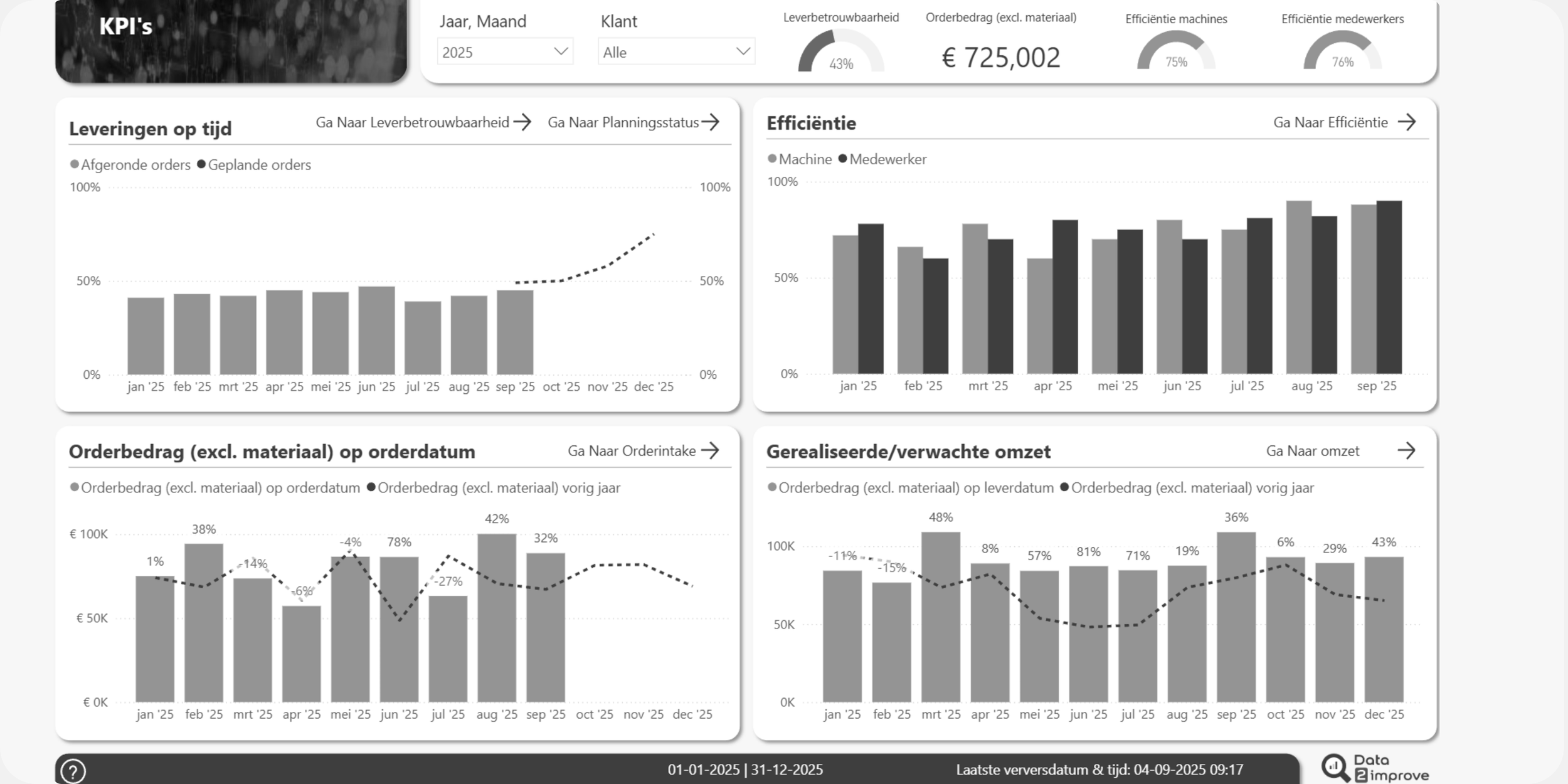 Stop met discussiëren over lijstjes. Begin met sturen op actuele data. Met een op maat gemaakt dashboard brengt Data 2 improve één versie van de waarheid boven tafel. We koppelen je data aan heldere overzichten, zodat kantoor en werkvloer naar dezelfde cijfers kijken. Zo zie je niet pas achteraf of een order winstgevend was, maar stuur je samen bij terwijl het proces nog loopt.